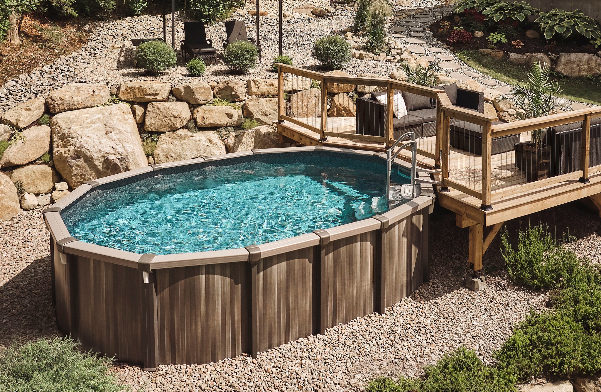 Why choose an above ground pool? Above ground pools have several advantages and one is that they can be very affordable. They are easily maintained, take up less space and allow you to maximize your yard space while still having the luxury of a swimming pool! The installation process is very quick and Backyard Masters stocks a massive amount of inventory so it is also the fastest option to start swimming!