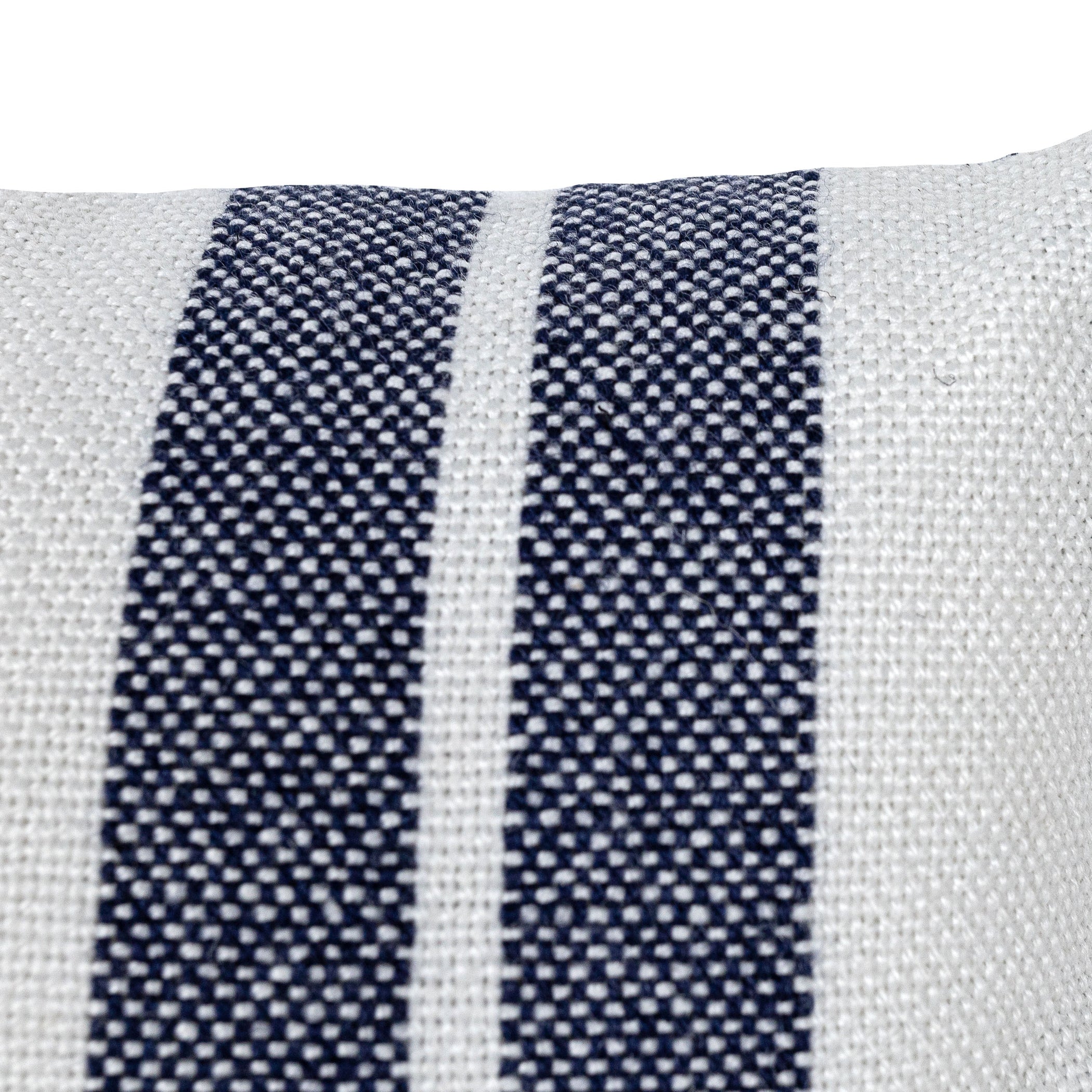Bold stripes woven into a white base on the front and the navy pillow backing create a visual dream. This lumbar pillow is inspired by cabana style stripes in different shades of blue. The tonal stripes in varying thicknesses, paired with the simple and clean edges offer a modern take on a classic blue and white motif. Hand-woven by artisans in India and made from recycled plastic bottles, each pillow is UV stabilized making it suitable for indoor and outdoor use with a quality you can feel.