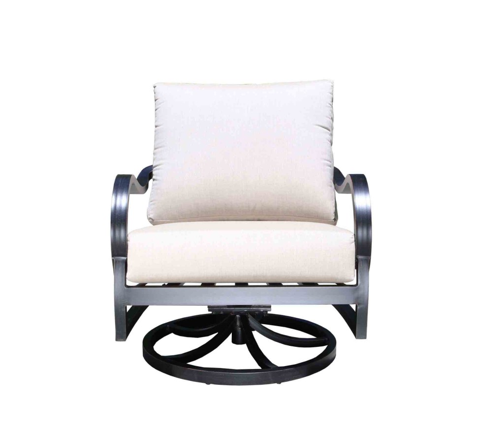 The Carleton Cast Aluminum Patio Furniture collection features a classic basketweave seat design with an entwined diamond back motif. Cushions made to order in Toronto. Fabric shown (all shots): 40428 Cast Ash, Pillows in 40430 Cast Oasis. Lounge Swivel Rocker is for residential use.