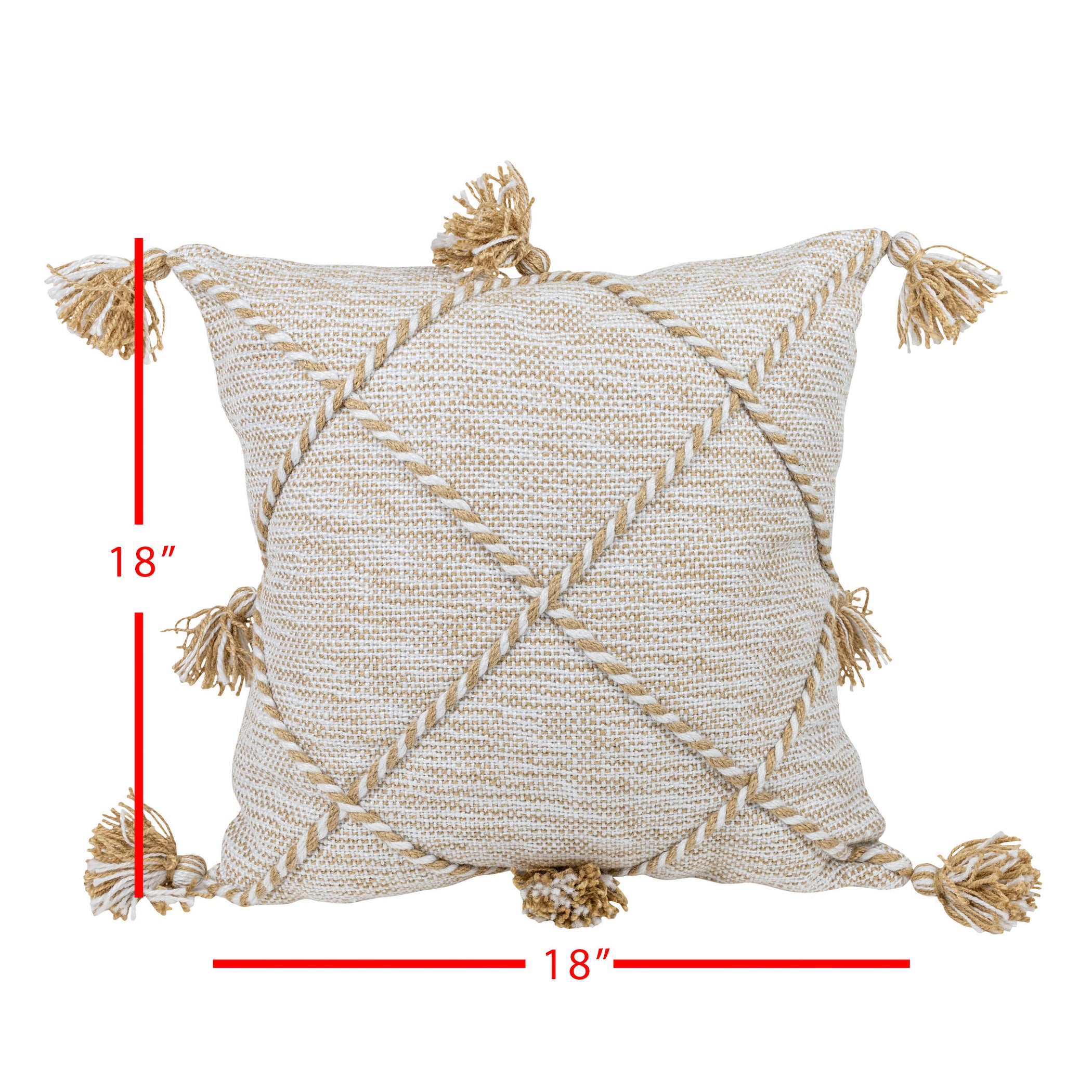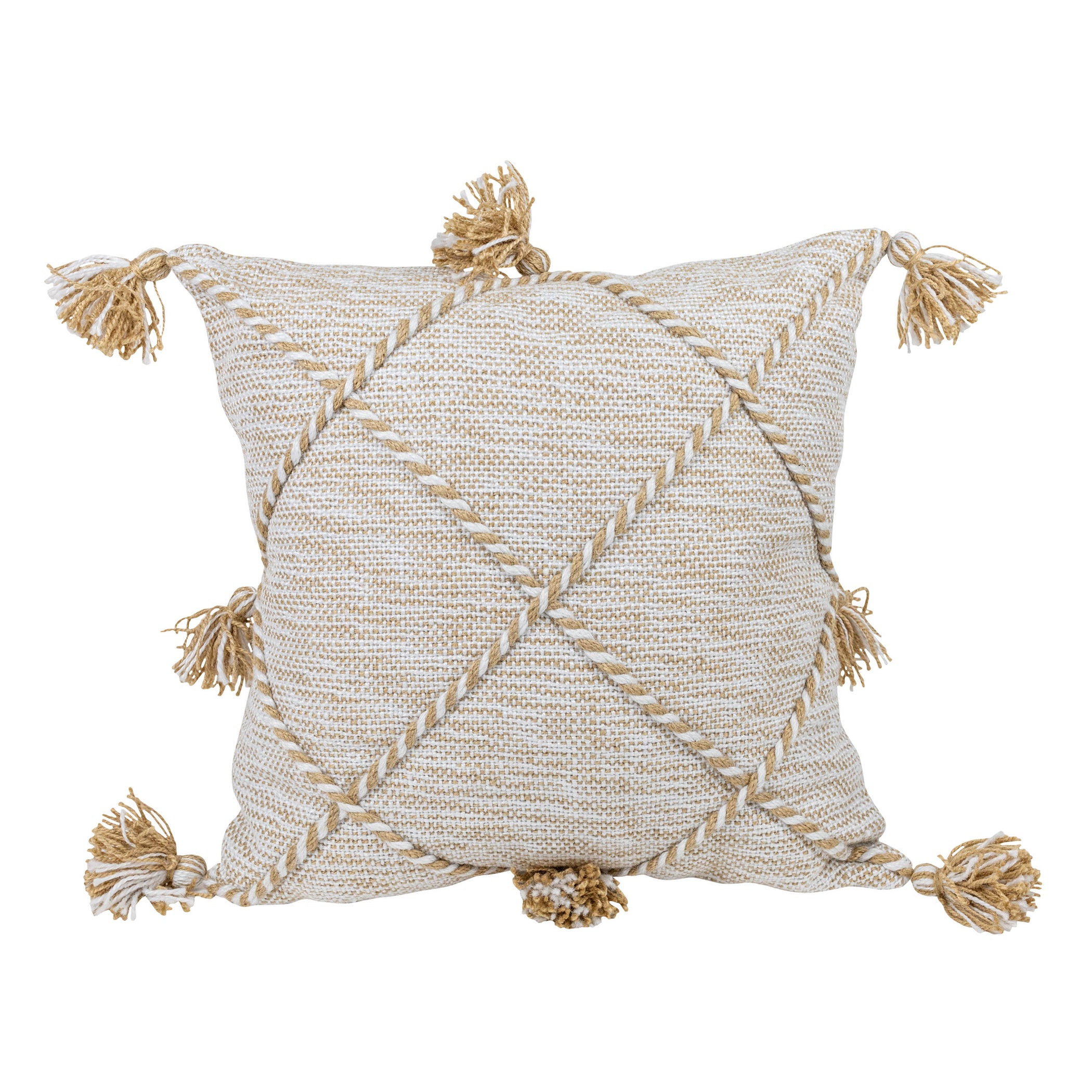 A coastal style pillow that will stand the test of time from Foreside Home & Garden. Woven with tan yarns and braided cords to create a textural, diamond pattern. This is a great neutral, transitional piece with fun accents. Create a cozy statement with other neutral textiles or layer in with colored pillows. Hand-woven by artisans in India.