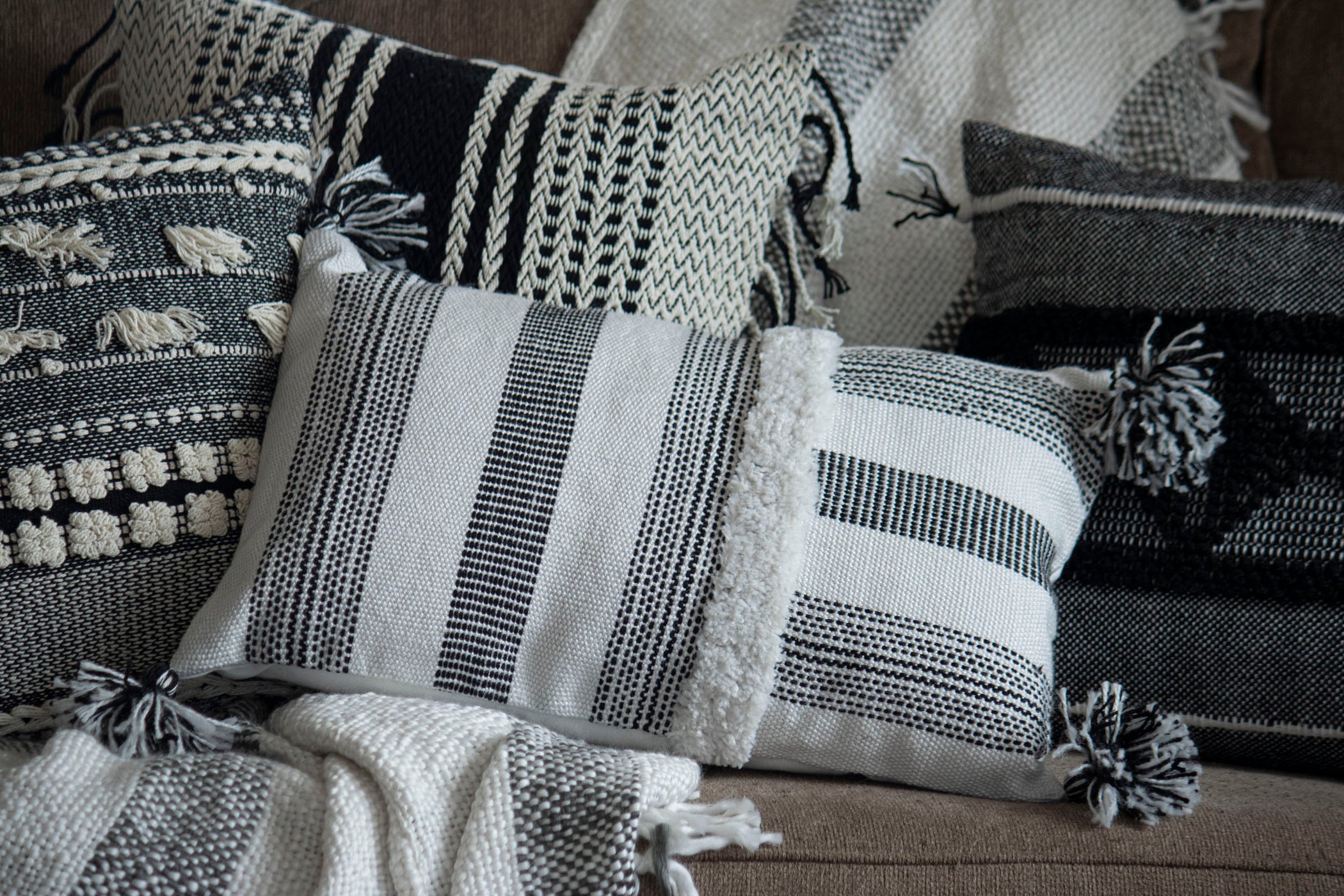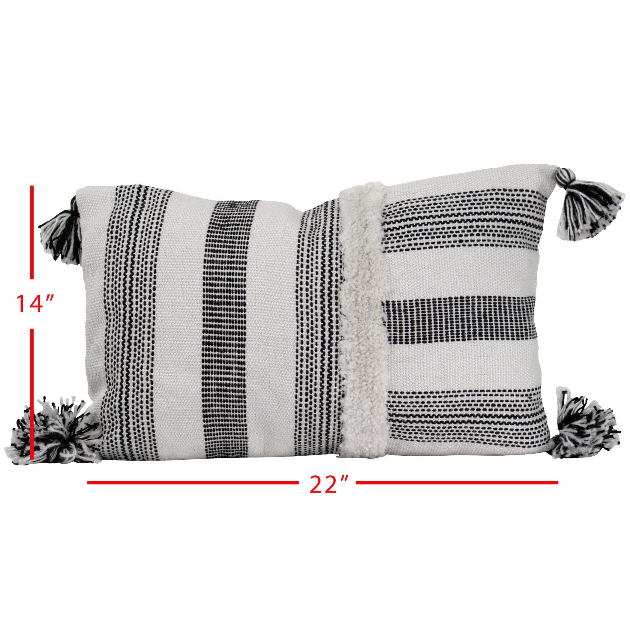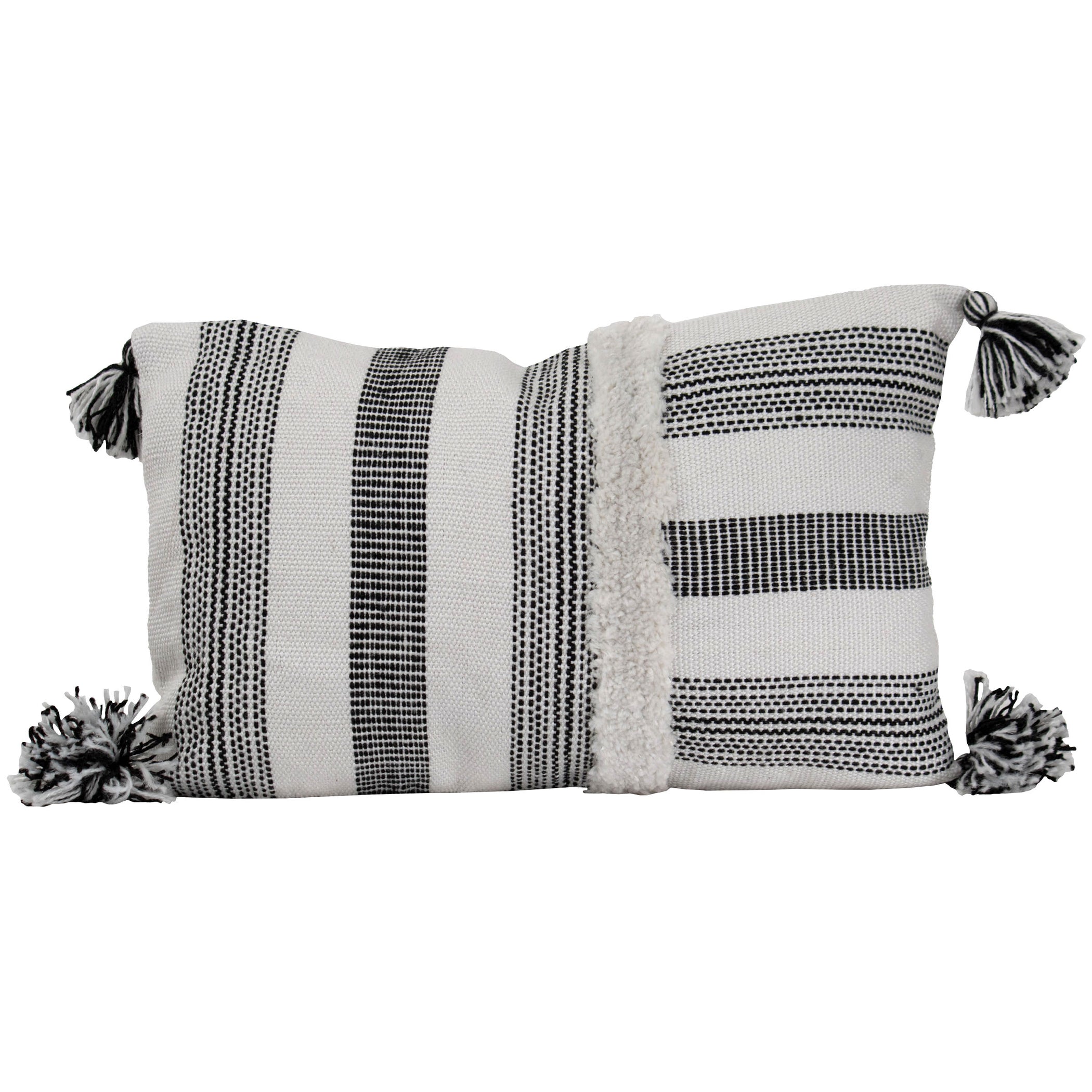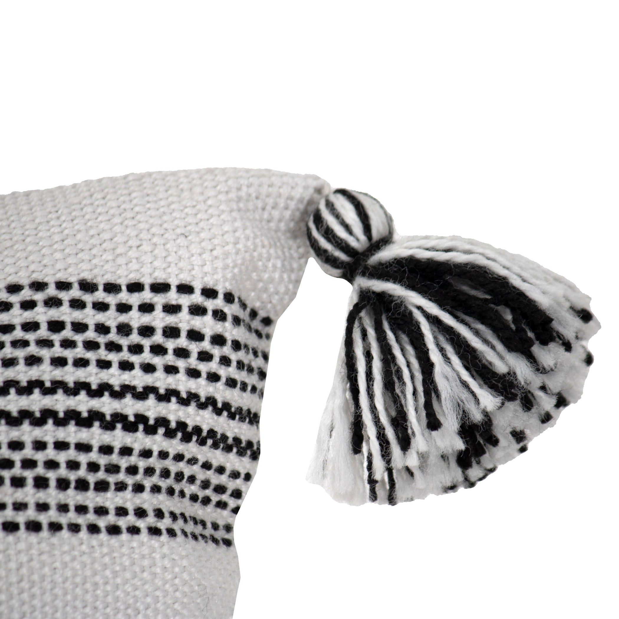 A boho inspired pillow exclusively from Foreside Home & Garden. Woven black and white stripes in different directions, tufting, and black and white tassels on the corners. A great pillow for pairing with modern farmhouse decor. Suitable both indoors and out and made of recycled PET plastic with quality you can feel. Hand woven by artisans in India.