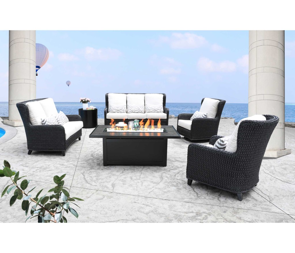 The Hudson collection is a transitional design, merging traditional wing chair styling with modern true black Sol Weave™twist wicker. Featuring a high back & aluminum feet, this collection is an excellent foil for any fabric, & it brings sophisticated design & comfort to both commercial & residential settings. Cushions made to order in Toronto. Fabric shown: 40012-0079 Fife Silver, close up Pillow in 145337-0002 Zebra Classic, group shot in 40012-0079 Fife Silver, Pillows in 145337-0001 Zebra Smoke. Hudson: limited inventory available.