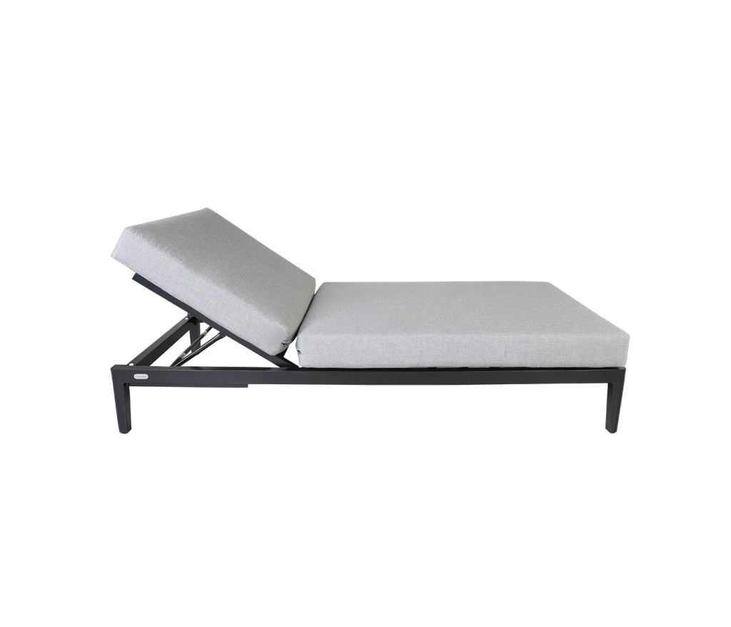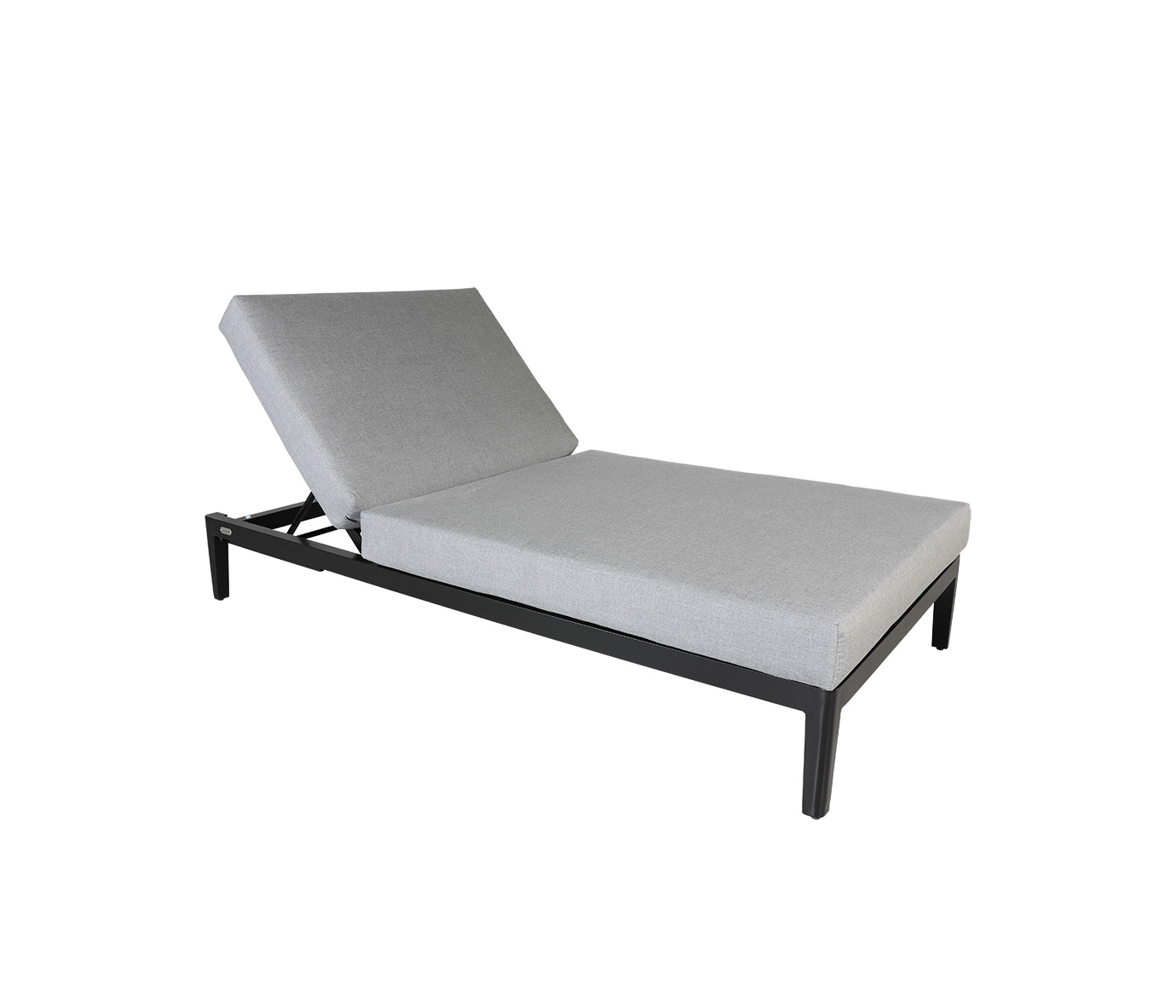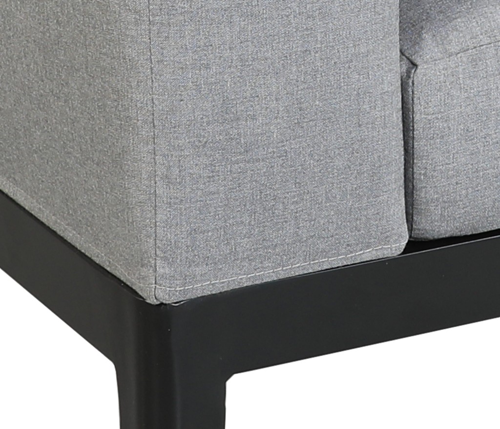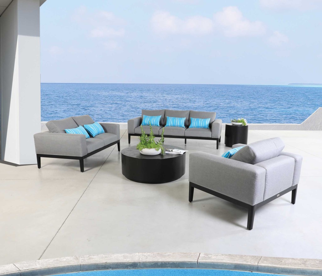 The Ibiza upholstered collection is crafted in the customer’s choice of outdoor performance fabric for a truly custom look, & may also be made with Sunbrella® RAIN Fabric. Boasting wide arms & generous seating room, Ibiza truly brings indoor design outdoors! Cushions & upholstery made to order in Toronto. Fabric shown: 15000-0003-77 Sunbrella® Spotlight Ash RAIN, sectional group shot fabric: 15000-0003-77 Sunbrella® Spotlight Ash RAIN, Pillows in 145501-0001 Mara Classic, deep seating group shot in 40434-77 Sunbrella® Cast Slate RAIN, Pillows in 51684-4 Carrara Maritime. Head rest pillow available at additional cost.