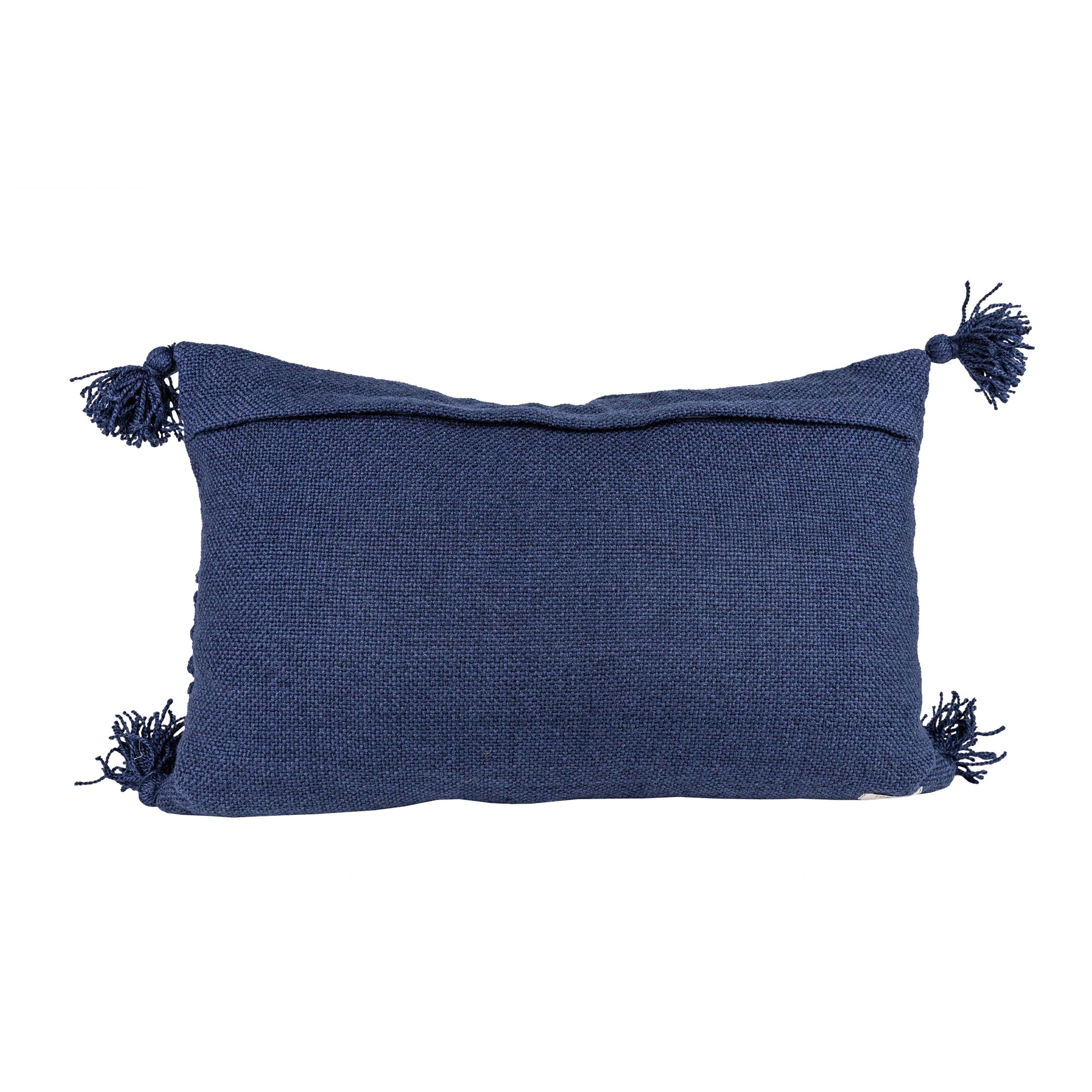 Two thick braided, woven accents create a boho vibe everyone will notice. The double line composed of braided blue yarns add a textural dimension that is accented with solid corner tassels. The dark navy solid color will pop in any color scheme. Made of recycled plastic bottles and hand-woven in India.