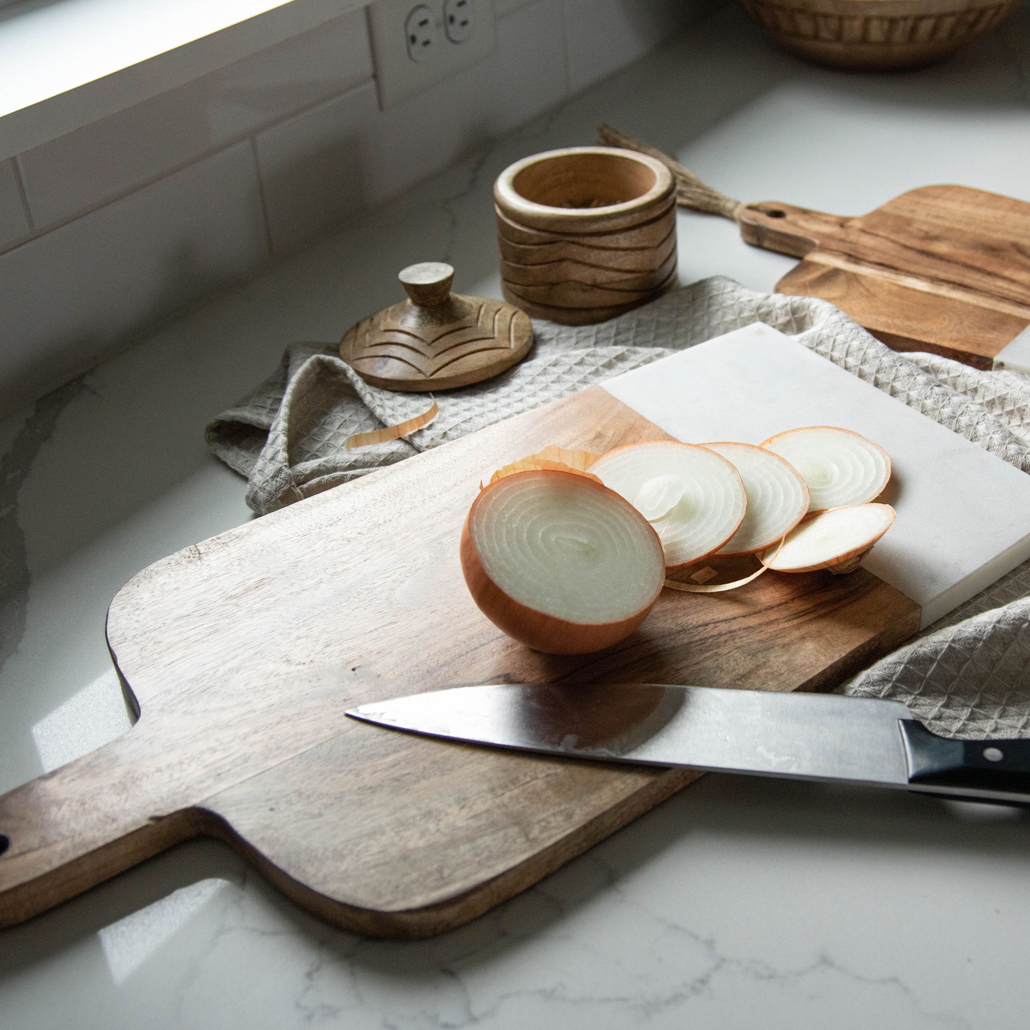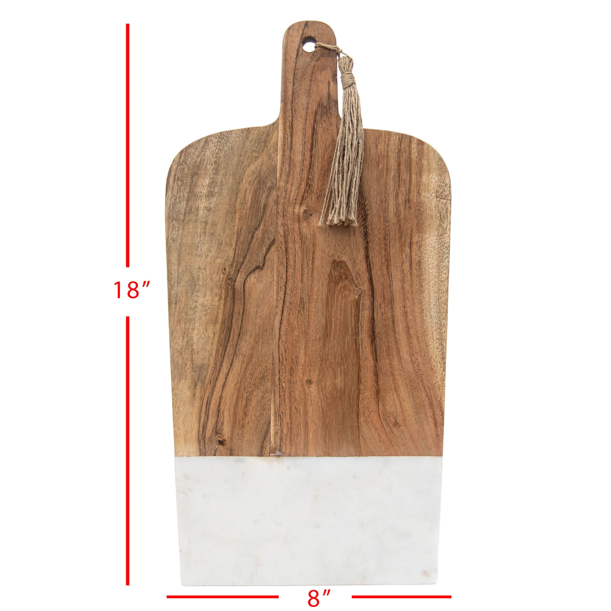 Refresh your modern farmhouse kitchen look with this long board from Foreside Home & Garden. Characterized by a sophisticated combination of solid white marble stone fused with sustainable acacia wood, this cutting board is perfect for all of your preparing and serving needs. It has a unique crafted quality that is combined with a basic functional shape, creating an essential piece for entertaining or simply to be displayed as a kitchen accent when not in use. Each board is accented by a jute tassel tied at the top.