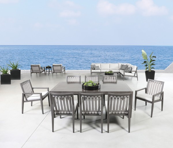 The Millcroft modern aluminum patio furniture dining table collection features durable aluminum and North American brand powder-coat paint. It is modern, clean, and has a unique hand applied finish to give it the appearance of a high end luxury look that is also maintenance free. The collection includes patio conversation sets, outdoor sectionals, and dining sets. Features umbrella hole.