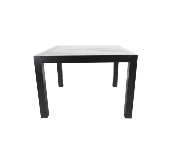 The Millcroft modern aluminum patio furniture dining table collection features durable aluminum and North American brand powder-coat paint. It is modern, clean, and has a unique hand applied finish to give it the appearance of a high end luxury look that is also maintenance free. The collection includes patio conversation sets, outdoor sectionals, and dining sets. Features umbrella hole.