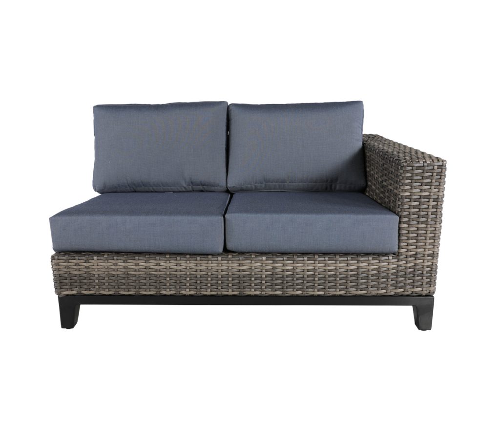 Naya’s crisp, contemporary lines in tonal grey flat SOL Weave™ Wicker grounded by a Black Aluminum frame brings an organic flow to an outdoor environment. Naya seamlessly blends modern style & relaxation with deep seating, sectional & dining options. Fabric shown: 14089 Twilight, group shot in 14089 Twilight, Pillows shown in 45889-0007 Savvy Indigo. Cushions made to order in Toronto.