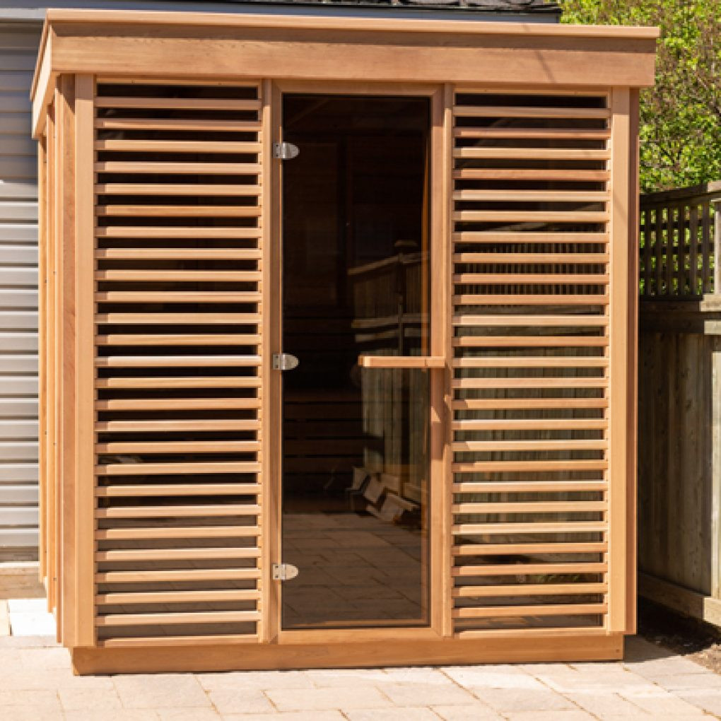 The Pure Cube CU570 Outdoor Sauna is a complex and stunning design that features a full glass door between the large window panels on the front wall. Revamp your outdoor entertainment area with optional semi-privacy panels that still feature the double pane tempered glass with a fixed cedar grill on the outside.