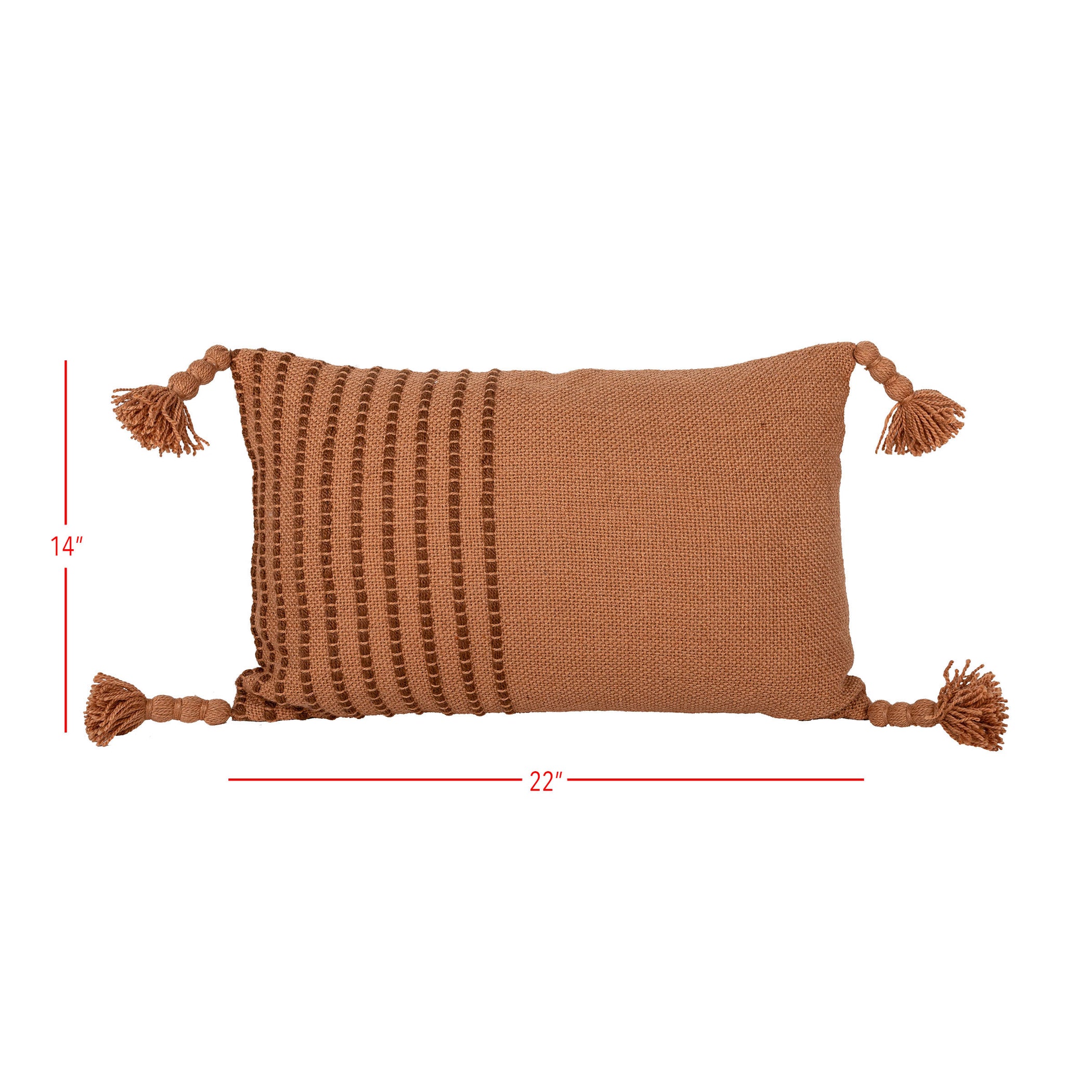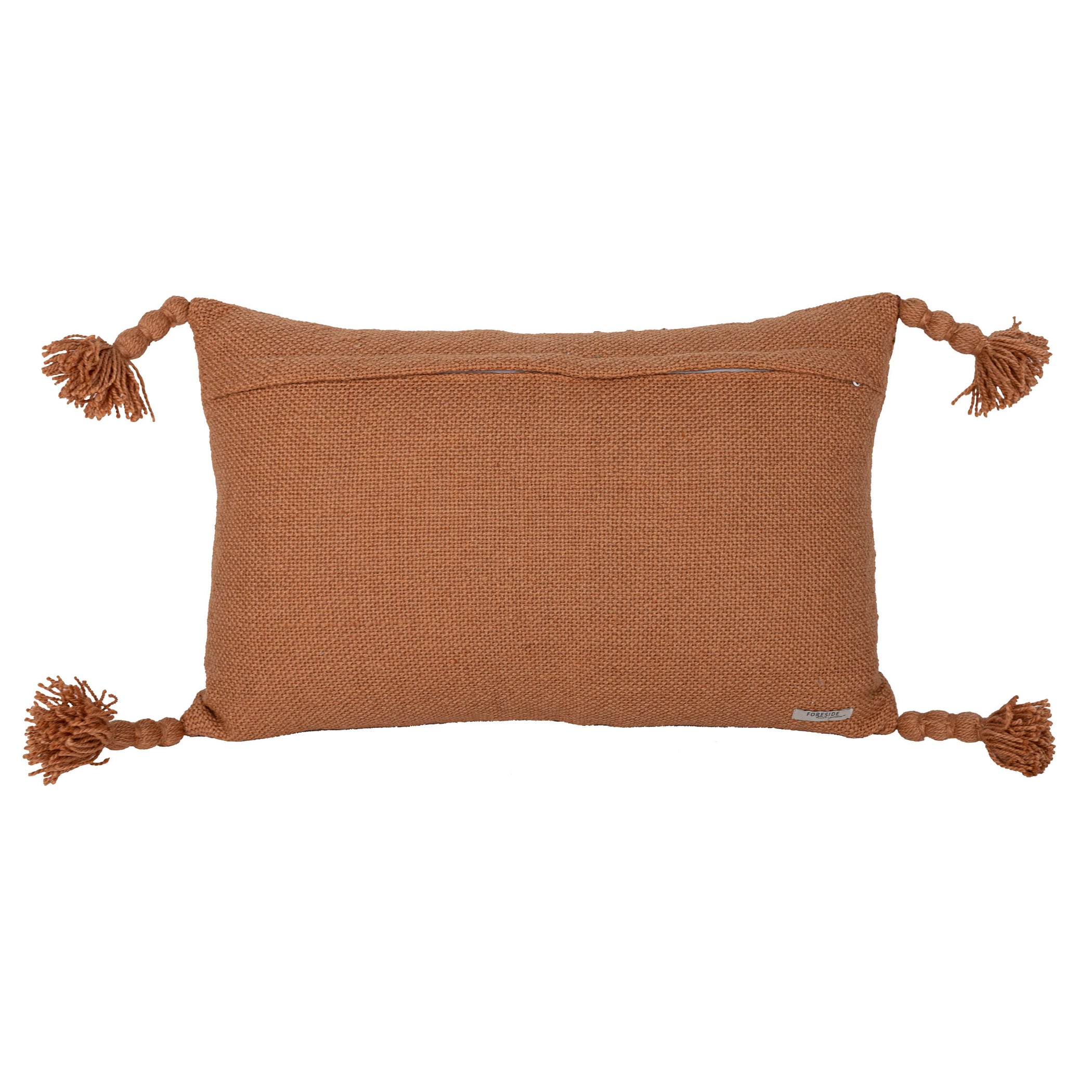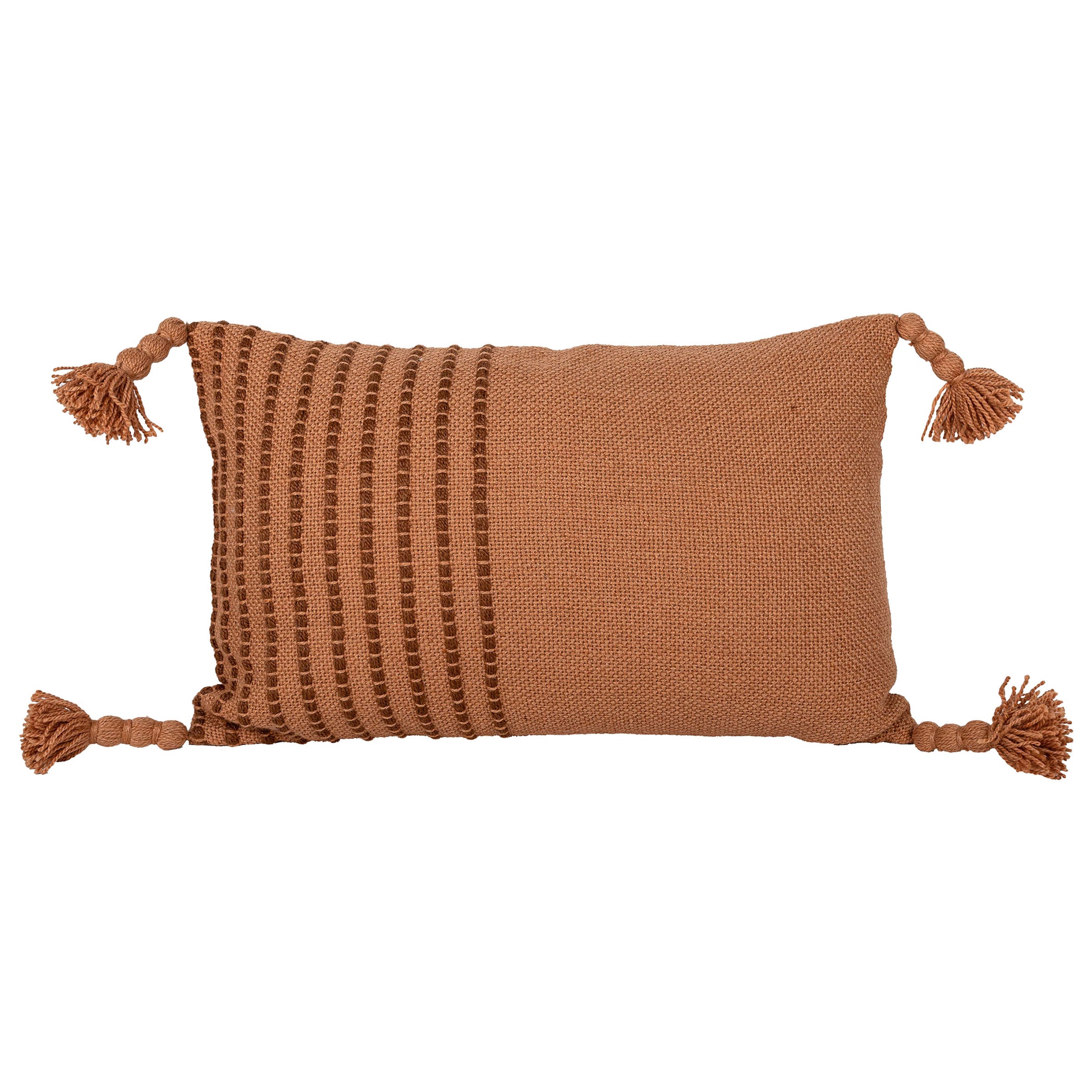 Inspired by the warmth of natural terracotta clay, a tonal rust colored lumbar pillow exclusively from Foreside Home and Garden. The rust-colored base is accented by terracotta tones in raised woven stripes on half the pillow and thread-wrapped braided tassels adorning each corner. Elements of texture elevate the boho style and refresh the classic stripe pattern. Hand-woven with fibers made from recycled plastic bottles and UV stabilized, this pillow is suitable for indoor and outdoor use.