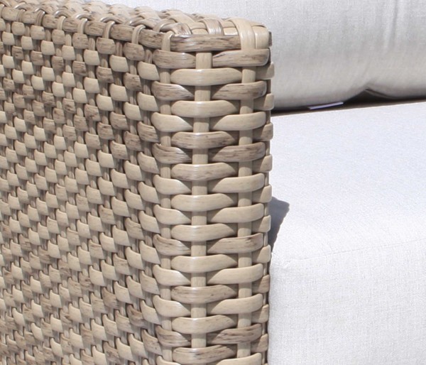 The Riverside patio furniture collection features wide style SolWeave® outdoor wicker on a powder coated aluminum frame with Sunbrella® fabric cushions. The look is modern and carefree thanks to the light colour of the Drift Teak finish. Choose from patio conversation sets, dining sets, and outdoor sectionals. Canadian made outdoor cushions shown are 40433 Cast Silver. The sectional group picture cushions shown are 40433 Cast Silver, Pillows 40434 Cast Slate.