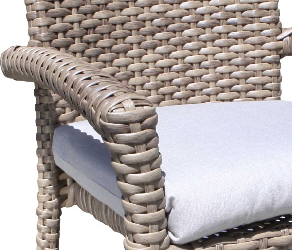 The Riverside patio furniture collection features wide style SolWeave® outdoor wicker on a powder coated aluminum frame with Sunbrella® fabric cushions. The look is modern and carefree thanks to the light colour of the Drift Teak finish. Choose from patio conversation sets, dining sets, and outdoor sectionals. Canadian made outdoor cushions shown are 40433 Cast Silver. The dining group picture cushions shown are 40433 Cast Silver. Stackable.