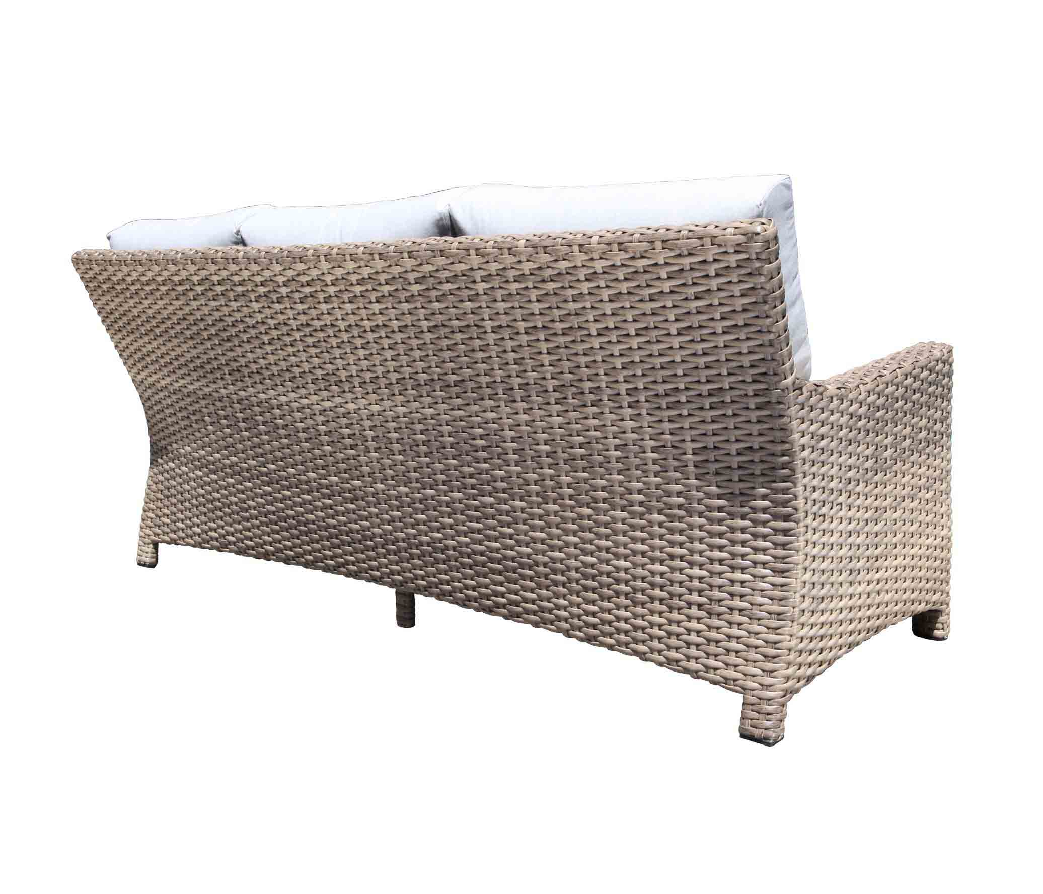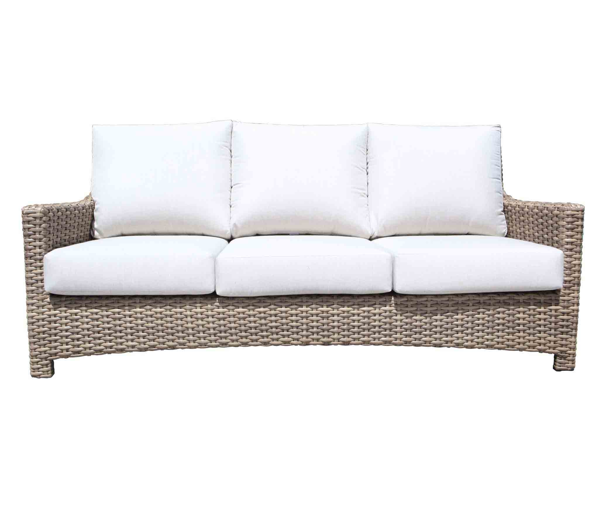 The Riverside patio furniture collection features wide style SolWeave® outdoor wicker on a powder coated aluminum frame with Sunbrella® fabric cushions. The look is modern and carefree thanks to the light colour of the Drift Teak finish. Choose from patio conversation sets, dining sets, and outdoor sectionals. Canadian made outdoor cushions shown are 40433 Cast Silver. The deep seating group picture cushions shown are 40433 Cast Silver, Pillows 40434 Cast Slate.