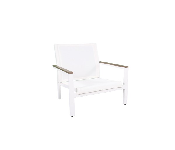 Relaxing in style is effortless with the Skye collection. The timeless, minimalistic profile and arched back add a subtle flair and superb comfort to this collection. Create a chic outdoor setting with two colorways: Black BatylineⓇ sling on a Black aluminum frame with Mica SOL Teak™ accents or White BatylineⓇ sling on a White aluminum frame with Umber SOL Teak™ accents. The Skye collection includes dining, deep seating, and, low-profile Spa and Sand seating options. Stackable.